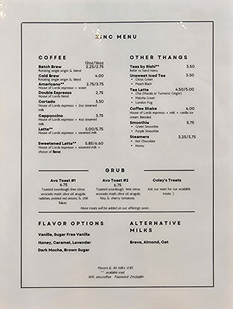 Welcome to Zinc Coffee, a delightful gem located at 1825 S Main St, Joplin, MO. This charming coffee shop offers a meticulously crafted menu that promises to cater to every coffee enthusiast's palate. Guests rave about the smooth, high-quality brews that avoid common pitfalls, such as stomach discomfort, making each sip a pleasure.